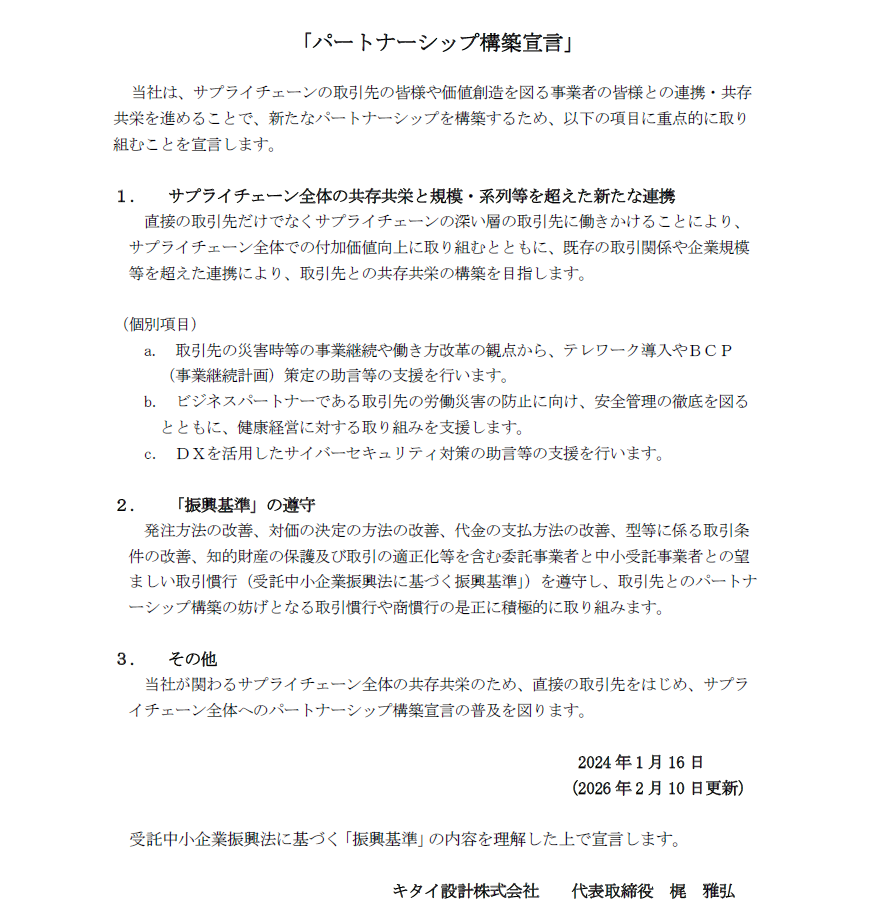 HOME > 新着情報 > 2026年2月10日「パートナーシップ構築宣言」を更新いたしました。 新着情報 2026/02/27 お知らせ 2026年2月10日「パートナーシップ構築宣言」を更新いたしました。 2026年2月10日「パートナーシップ構築宣言」の内容につきまして、以下の通り更新いたしました。 掲載先:「パートナーシップ構築宣言」ポータルサイト 2026年2月5日 東北農政局農業農村整備事業優良工事等表彰を受賞しました! 一覧に戻る 2027卒 新卒採用活動がスタートしました! 一覧に戻る
