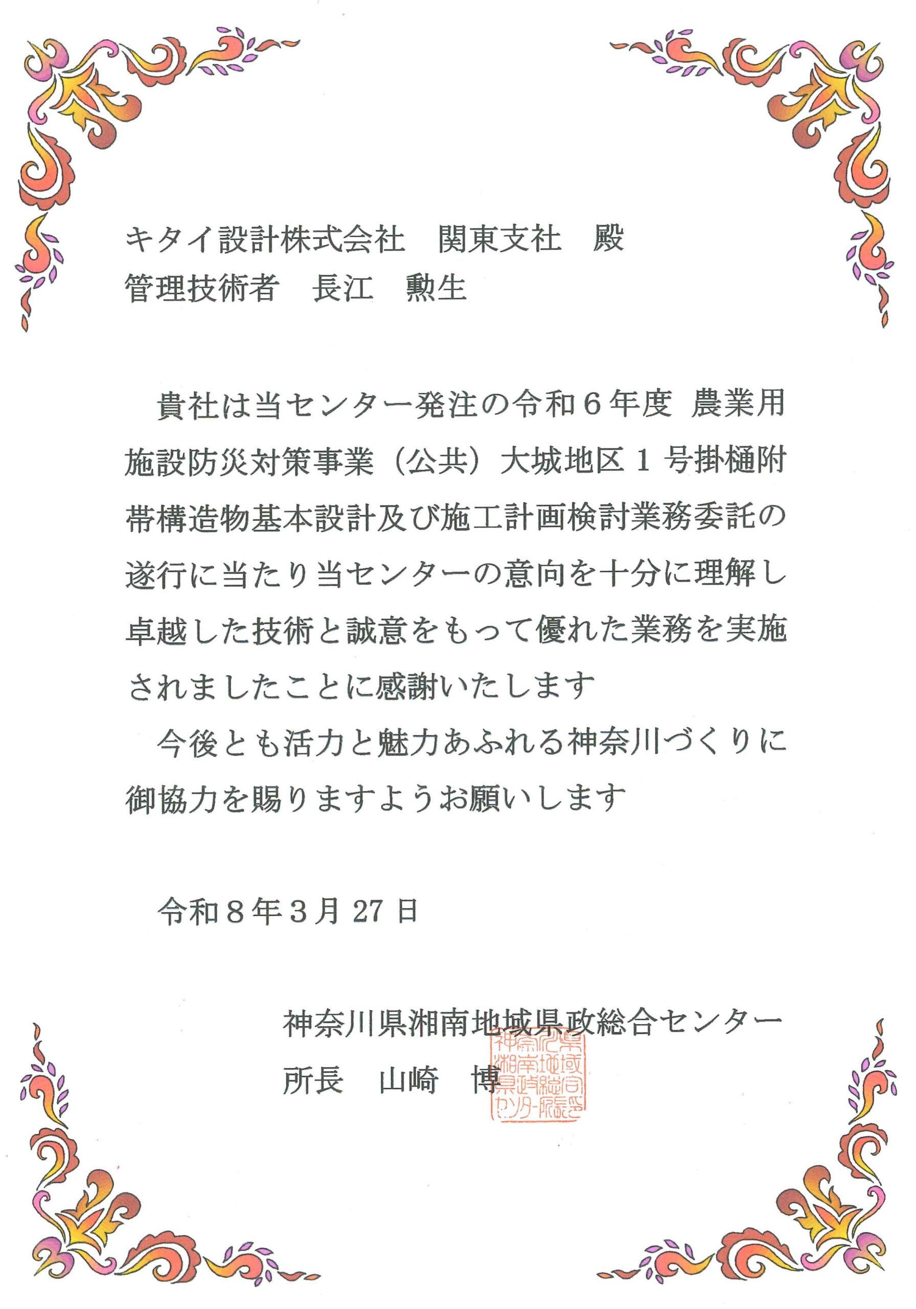 2026年3月27日 神奈川県湘南地域県政総合センター 所長礼状を受賞しました!